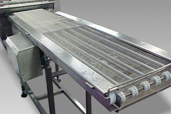 不銹鋼網(wǎng)帶輸送機(jī)系金屬網(wǎng)帶輸送機(jī)的一種,采用金屬絲編制的網(wǎng)帶為載體,兩側(cè)加裝鏈條中間用穿銷連接,采用鏈輪傳動鏈條從而使網(wǎng)帶沿鏈條傳送方向而運(yùn)動;也可以直接用特制的包膠輥筒來直接帶動網(wǎng)帶動作,前者一般適用于物料重量較重且長度較長的輸送形式,用于冷卻、吹干等行業(yè)要求的輸送,故而網(wǎng)帶密度較稀,后者一般采用較為密集的網(wǎng)帶,適用于物料較小輸送距離較短又或特殊物體的輸送,例如帶強(qiáng)磁性物料的輸送。重型網(wǎng)帶輸送機(jī)一般長度不超過15米,寬度不超過2米;輕型不銹鋼網(wǎng)帶輸送機(jī)長度一般不超過10米。
