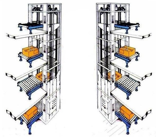往復式垂直提升機,由機架、提升鏈條、傳動軸、馬達及相關安全設備、電控幾部分組成,進出口位置可根據(jù)需要設置,類型包含:Z型、C型、E型、F型等幾種類型;適用于托盤、貨物、大件紙箱、噸袋、噸桶、卡板等≤2000kg貨物的的層間穿梭升降...